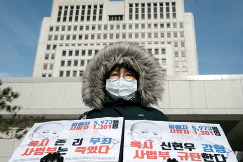 | ‘가습기 살균제 참사’ 사건의 대법원 상고심 선고가 내려진 지난 25일 강은 피해자가 서울 대법원 앞에서 존 리 전 옥시 대표의 무죄 선고 등을 비판하는 기자회견에 참가해 피켓을 들고 있다. |