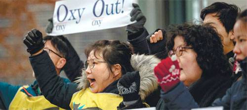 | 강은 피해자가 지난달 8일 서울 여의도 옥시 본사 앞에서 항의행동에 참가해 구호를 외치고 있다. |