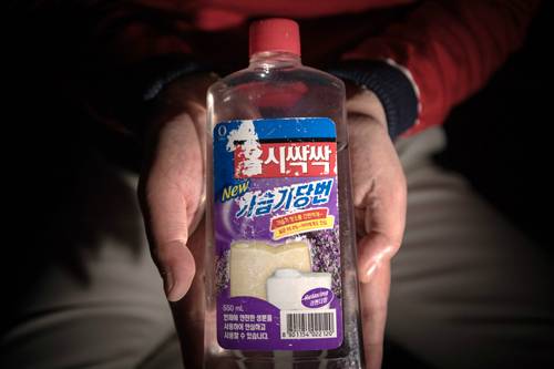 | 안은주 피해자가 자택에 남아 있는 가습기 살균제를 들어 보이고 있다. |