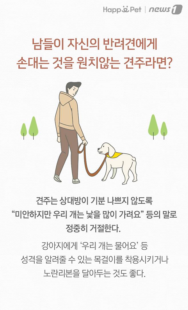 남들이 자신의 반려견에게 손대는 것을 원치않는 견주라면? 견주는 상대방이 기분 나쁘지 않도록 "미안하지만 우리 개는 낯을 많이 가려요" 등의 말로 정중히 거절한다. 강아지에게 '우리 개는 물어요' 등 성격을 알려줄 수 있는 목걸이를 착용시키거나 노란리본을 달아두는 것도 좋다.