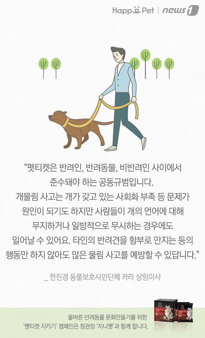 "펫티켓은 반려인, 반려동물, 비반려인 사이에서 준수돼야 하는 공동규범입니다. 개물림 사고는 개가 갖고 있는 사회화 부족 등 문제가 원인이 되기도 하지만 사람들이 개의 언어에 대해 무지하거나 일방적으로 무시하는 경우에도 일어날 수 있어요. 타인의 반려견을 함부로 만지는 등의 행동만 하지 않아도 많은 물림 사고를 예방할 수 있답니다." 전진경 동물보호시민단체 카라 상임이사.