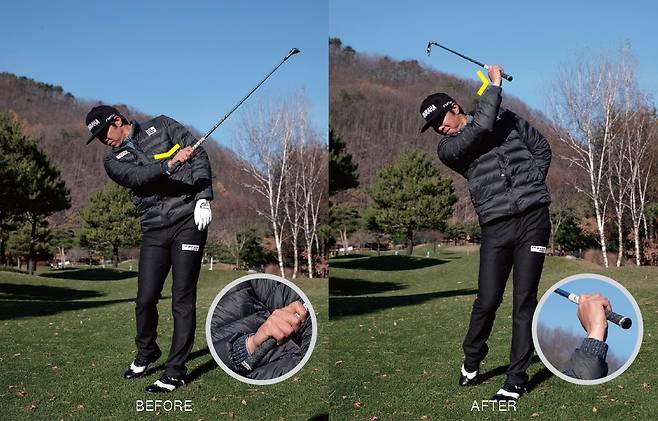 → 백스윙 톱에서 오른쪽 팔꿈치가 벌어지는 동작이 발생한다.