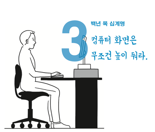 백년 목 10계명 제3계명. 컴퓨터 작업을 하는 좋은 자세. 모니터에 위치가 중요하다. 컴퓨터 작업할 때 목과 어깨가 아프다면 모니터의 위치를 체크해 봐야 한다.