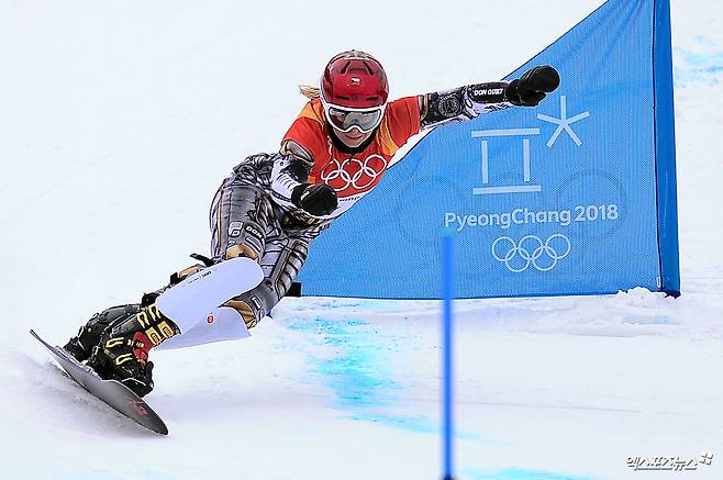 [엑스포츠뉴스 평창, 김한준 기자] 24일 강원도 평창 휘닉스 스노 경기장에서 열린 2018 평창동계올림픽 여자 스노보드 평행대회전 예선에서 에스더 레데츠카(체코)가 레이스를 펼치고 있다.