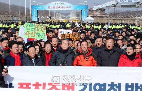 [경향포토] 통일대교 막고 애국가 부르는 홍준표 대표