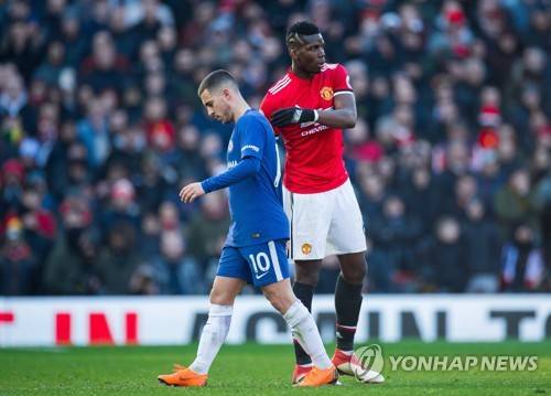 epa06565209 Chelsea’s Eden Hazard (L) reacts with Manchester United’s Paul Pogba (R) during the English Premier League soccer match between Manchester United and Chelsea FC held at Old Trafford, Manchester, Britain, 25 February 2018. EPA/PETER POWELL EDITORIAL USE ONLY. No use with unauthorized audio, video, data, fixture lists, club/league logos or 'live' services. Online in-match use limited to 75 images, no video emulation. No use in betting, games or single club/league/player publications.