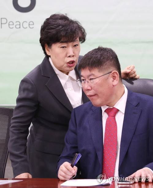 (서울=연합뉴스) 김주형 기자 = 민주평화당 조배숙 대표가 26일 오전 국회에서 열린 의원총회 도중 김경진 의원과 대화하고 있다. 2018.2.26