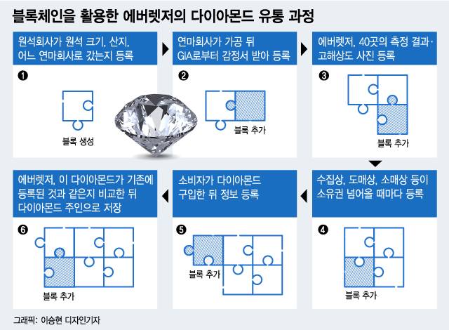우선 원석 채굴회사는 원석의 크기, 산지, 어느 연마회사로 갔는지 등의 정보를 블록으로 등록한다. 다음으로 연마회사가 다이아몬드를 가공한 뒤 세계적 감정기관 GIA로부터 감정서를 받아 관련 정보를 블록으로 추가한다. 그러면 에버렛저는 이 다이아몬드에 대해 40군데를 측정해 그 결과 고해상도 사진을 다시 해당 다이아몬든 블록에 등록한다. 이후 수집상, 도매상, 소매상 등도 소유권이 넘어올 때마다 블록이 추가된다.