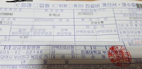 | 부산백병원 측이 지난 23일 이미 고인이 된 주옥녀(87)씨 명의로 진료예약을 한 뒤 진료비 1만 8800원을 수납한 영수증. 예약자 명이 지난 15일 사망한 주씨 명으로 돼 있다. 유족은 주씨가 이송 간 타 대학병원에서 말기암으로 이미 사망한 사실을 수차례 설명했으나 백병원 측은 이를 무시했다. 유족 제공 |