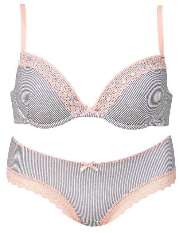 이번에 선보인 와이어몰드 브라 세트는 블랙, 아이보리 컬러가 조화된 스트라이프 나염 원단에 오렌지 컬러 레이스를 포인트로 더해 귀여우면서도 발랄한 느낌의 디자인이 특징이다.