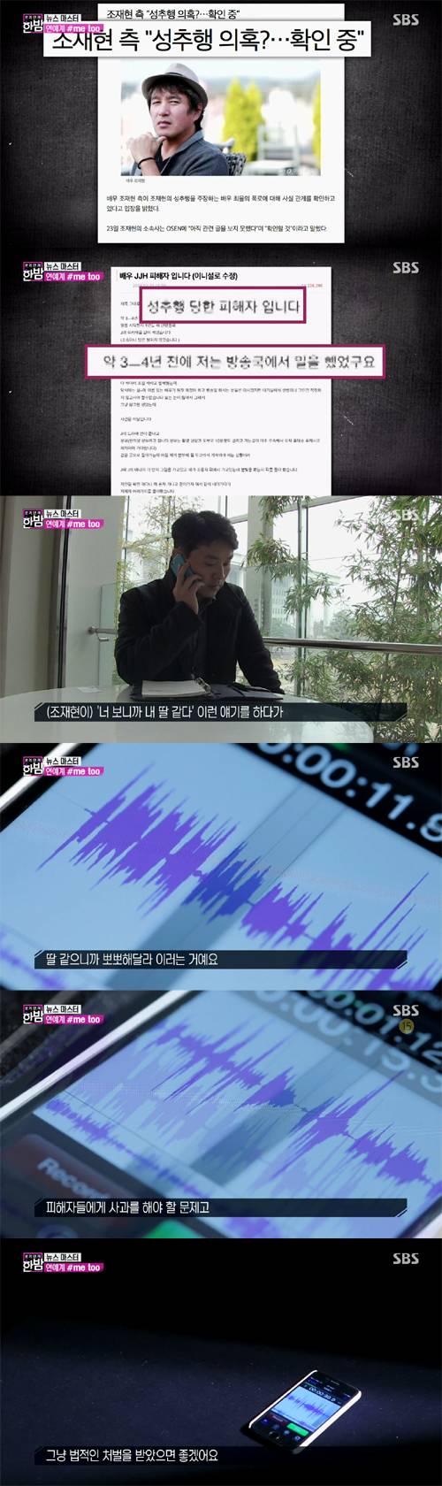 27일 오후 방송된 SBS '본격연예 한밤'(이하 '한밤')에서 신동헌은 "조재현 역시 성추행 당사자였다는 증언이 나왔다. 다름 아닌 방송국 스태프를 추행했다는 폭로"라고 전했다.