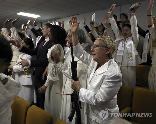 (뉴파운드랜드<美펜실베이니아주> AP=연합뉴스) 지난달 28일(현지시간) 미국 펜실베이니아주 뉴파운드랜드에 있는 '세계평화·통일 생추어리' 교회에서 열린 합동결혼 축복 예배에 한 여성 신도(앞줄 오른쪽)가 왕관을 쓴 채 총알이 없는 빈 자동소총을 들고 참석하고 있다.