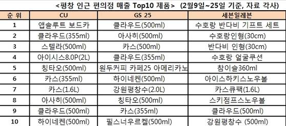 하지만 정작 1위를 차지한 제품은 대부분 맥주가 아니었습니다. GS25에선 클라우드 캔맥주(500ml)가 가장 많이 팔렸지만 CU에선 앱솔루트 보드카가, 세븐일레븐에선 평창올림픽 마스코트인 수호랑ㆍ반다비 선물세트가 1위를 차지한 겁니다.