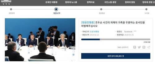 지난달 23일에 올라온 이번 청원은 마감일인 25일을 21일 앞두고 20만 명이 참여함으로써 청와대 수석비서관 또는 관련 부처 장관이 공식 답변을 내놓기로 한 기준인 '한 달 내 20만 명 참여'를 충족했다.