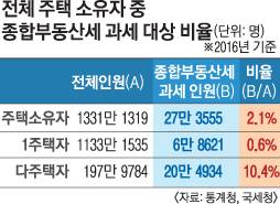 정부의 종합부동산세 등 보유세 강화 방침에 대해 ‘세금 폭탄’ 우려가 나오고 있지만 정작 과세 대상은 전국 주택 소유자 100명 중 2명꼴에 불과한 것으로 나타났다.