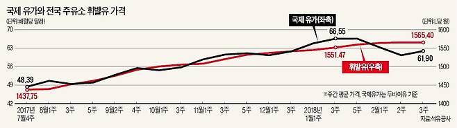 우리가 쓰는 기름이 원유가 아니라 정유공장에서 원유를 정제해 생산하는 휘발유·경유라는 점도 변수다. 이미 생산된 휘발유가 있으면 국내 기름값에 반영되는 데 시차가 생겨서다. 지난해 8월 말 미국 멕시코만 일대를 강타한 허리케인 ‘하비(Harvey)’ 여파로 원유 정제 시설이 타격을 입었을 때가 대표적이다. 당시 9월 첫째주에서 10월 첫째주까지 한 달간 국제 유가(두바이유 기준)는 배럴당 51.99달러에서 54.63달러로 5%(2.64달러) 올랐지만 같은 기간 국내 휘발유값은 1466.27원에서 1500.45원으로 2.3%(34.18원) 상승하는 데 그쳤다.