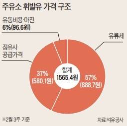 국내 휘발유값에서 유류세가 차지하는 비중은 60%에 가깝다. 석유공사가 공개한 2월 셋째주 전국 휘발유 평균 가격 구조를 살펴보면 L당 1565.4원인 주유소 판매 가격 중 유류세가 888.7원으로 57%나 된다. 유가가 포함된 정유사 공급 가격은 37%(580.1원)며, 유통비용 및 주유소 마진은 6%(96.6원)에 불과하다. 경유의 유류세 비중도 48%(653.0원)에 이른다.