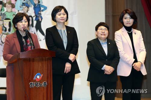(서울=연합뉴스) 임헌정 기자 = 세계여성의날인 8일 오후 서울 마포구청 대강당에서 열린 한국노총 여성노동자대회에서 더불어민주당 남인순 의원(왼쪽)이 축사하고 있다. 사진 왼쪽부터 남 의원, 정의당 이정미 대표, 자유한국당 임이자 의원, 더불어민주당 한정애 의원. 2018.3.8