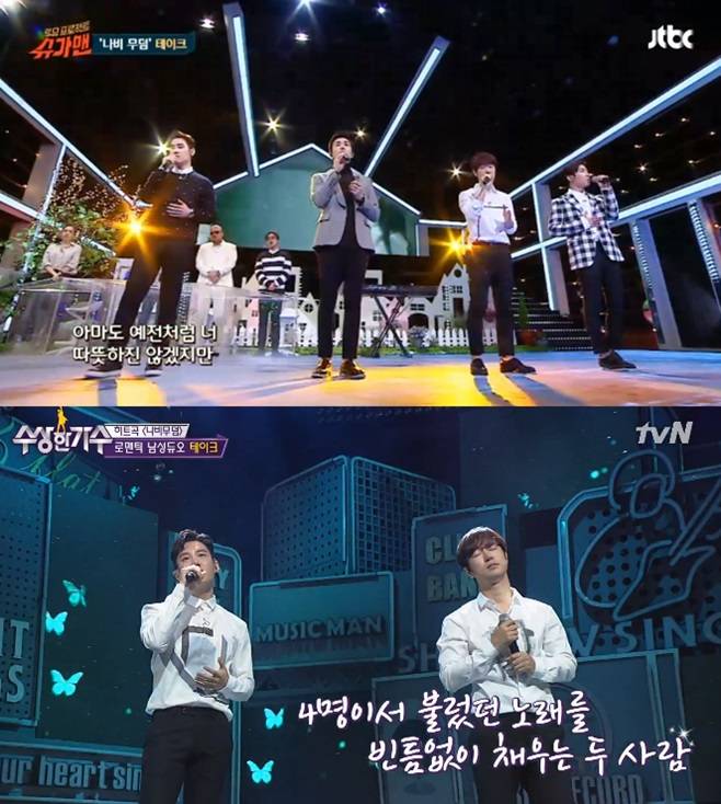테이크는 앞서 지난 2016년 4월 '슈가맨'에 출연해 원년 멤버 이승현, 김도완과 함께 히트곡 '나비무덤' 무대를 꾸며 큰 화제를 모았다. 특히 테이크는 '슈가맨'에서 4인조 완전체로 무대에 올라 한층 업그레이드된 보컬 실력과 훈훈한 비주얼을 자랑해 시선을 사로잡았다.