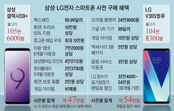 삼성전자·LG전자가 8일까지 진행한 최신 스마트폰 사전 구매 행사를 본지가 분석해보니, 사은품·할인 혜택의 총합이 스마트폰 가격의 절반에 육박하는 것으로 나타났다. 삼성전자의 최신 스마트폰 '갤럭시S9 플러스(64기가바이트)'의 가격은 105만6000원이다. 이 제품을 삼성전자 공식 온라인몰에서 구매하면 총 8가지의 사은품과 할인 혜택이 있다. 스마트폰을 PC처럼 활용할 수 있는 연결기기 덱스패드(DexPad)를 비롯해 화면 수리비 50% 지원, 중고폰 우대 매입, 삼성 멤버십 포인트, TV·음악 서비스 이용권, 영화·드라마 VOD(주문형 비디오) 이용권, 게임 아이템, 화면 보호필름 등이다. 사은품과 할인 혜택을 모두 합하면 약 47만원이다.