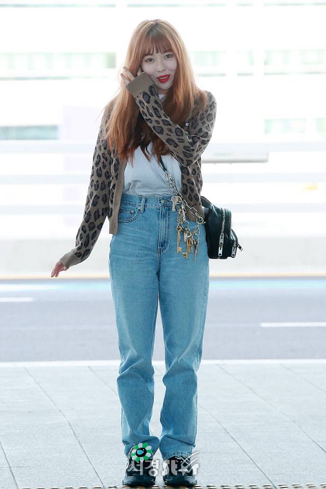 가수 현아가 공항패션을 선보이며 홍콩으로 출국하고 있다.