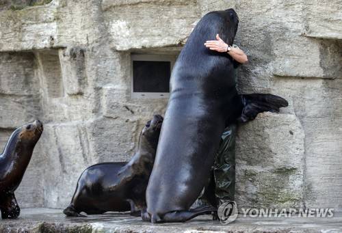 epa06591388 A keeper hugs a South American sea lion at Tiergarten Schoenbrunn Zoo in Vienna, Austria, 09 March 2018. Temperatures rose up to 14 degees Celsius after Austria was hit by a cold wave last week. EPA/LISI NIESNER