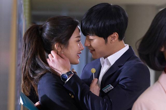 공개된 스틸 속 우도환-문가영은 그야말로 대범한 고등학생 커플. 교복차림의 두 사람은 학교 복도 한복판에서 거침없는 애정표현을 하고 있어 눈길을 끈다. 특히 우도환-문가영은 껌딱지처럼 달라붙은 채로 꿀이 뚝뚝 떨어지는 눈빛으로 서로를 바라보고 있는데 금방이라도 닿을듯한 입술이 아찔하다.