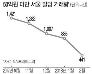 서울 꼬마빌딩 거래 감소는 지난해 말부터 계속된 현상이다. 지난해 10월 1421건 이후 11월 1282건, 12월 1007건으로 줄었고 올해 1월 들어서는 885건으로 1000건이 무너졌다. 지난해 연간 상업용 부동산 거래 금액이 23조5315억원으로 사상 최대를 기록한 것과는 대조적인 모습이다. 2월 거래량은 최근 3년 월평균 거래량(1022건)과 비교하면 57% 급감했다. NAI프라퍼트리 측은 "2006년 실거래 통계 작성 이후 월 거래량이 500건 이하로 집계된 것은 처음"이라고 덧붙였다. 같은 날 중소형 빌딩 전문 중개법인 리얼티코리아에서 발표한 보고서에서도 꼬마빌딩 거래 감소는 비슷하게 나타났다. 리얼티코리아 조사에 따르면 2월 서울 빌딩 거래량은 49건으로 전월(64건) 대비 23.4% 줄었다. 50억원 이하 빌딩은 32건으로 전월(40건) 대비 20% 줄었고, 50억~100억원 거래량은 17건에서 9건으로 47% 급감했다. 반면 100억~200억원 거래량은 5건에서 6건으로 오히려 늘었고 200억원 이상 거래량도 2건을 유지했다. NAI프라퍼트리 조사와 마찬가지로 리얼티코리아 표본조사에서도 규모가 작은 빌딩의 거래 감소가 유독 두드러진 셈이다.