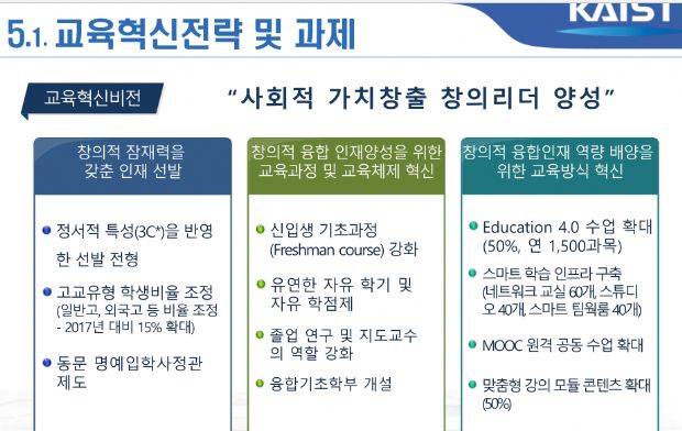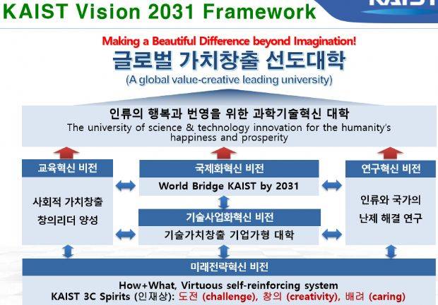 카이스트는 이 비전을 실현하기 위한 새로운 시대 정신으로 ▲창의(Creativity) ▲도전(Challenge) 배려(Caring) 등 ‘3C'를 제시했다. 또 ▲교육혁신 ▲연구혁신 ▲기술사업화 혁신 ▲국제화혁신 ▲미래전략 혁신 등 약 30개항의 5대 혁신안도 마련했다. 이들 5대 혁신안은 각 분야별로 5년씩 총 3단계(1단계: ~2021년, 2단계: ~2026년, 3단계: ~2031년)로 나눠 진행된다.