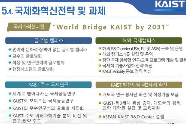 KAIST의 국제적 역량을 배양하고 위상 증진을 위해 ▲글로벌 캠퍼스 ▲해외 국제캠퍼스 ▲KAIST 주도 국제연구 ▲KAIST 발전 모델 제3세계 확산 등을 추진한다.