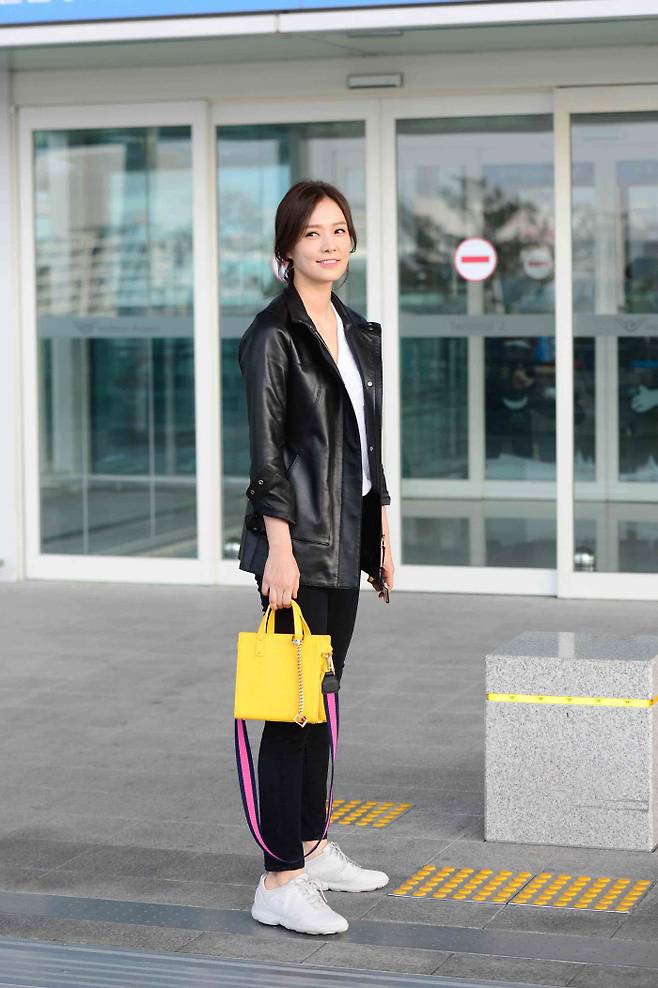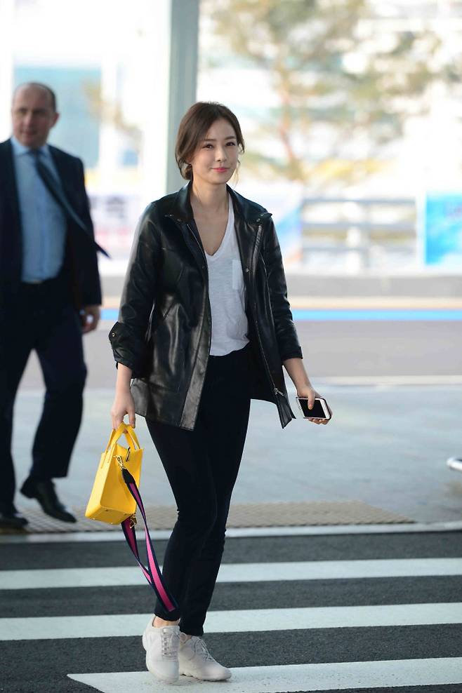 이날 손태영은 블랙 바지와 가죽 재킷에 화이트 스니커즈를 곁들여 깔끔한 ‘시크룩’을 선보였다. 여기에 스와로브스키 크리스털이 장식된 노란색 숄더백으로 포인트를 주며 성큼 다가온 봄을 표현했다.