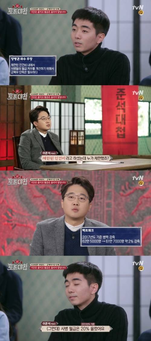 바른미래당 서울 노원구병 당협위원장을 맡고 있는 이준석은 지난 13일 방송된 tvN 예능 프로그램 '토론대첩-도장깨기'(이하 '토론대첩')에 '토론 고수'로 출연해 대학생들을 상대로 군복무 단축 문제 등에 대해 토론했다.