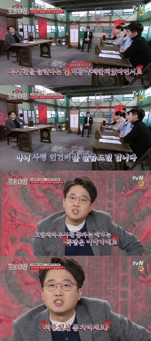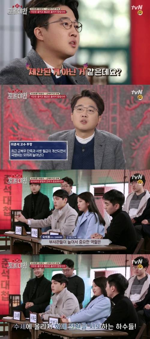 대학생들은 시작부터 수세에 몰렸고, 인하대에 재학 중인 오석종씨는 "논쟁의 핵심은 18개월로 줄었을 때 얼마나 전투력이 약해질까가 관건"이라며 "전투력이 떨어진다는 것에 공감이 안 되는 게 부사관들이 늘어서 중요한 역할을 맡고 있기 추세이기 때문"이라고 주장했다.