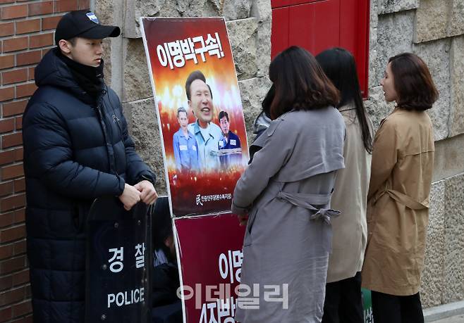 [이데일리 방인권 기자] '뇌물수수, 횡령, 조세포탈' 등 혐의를 받는 이명박 전 대통령의 검찰 소환일인 14일 오전 서울 강남구 논현동 이 전 대통령 자택에 앞에서 한 시민이 피켓 시위를 하자 경찰들이 피켓을 안보이게 막고 있다.