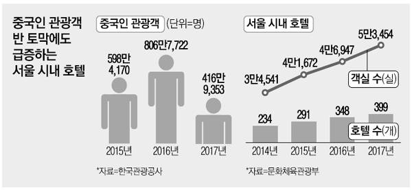이처럼 호텔은 급증했는데 객실을 채워줄 관광객은 급격히 줄었다. 사드 갈등으로 한국에 발길을 끊은 유커가 그 중심에 있다. 한국관광공사에 따르면 지난해 방한한 유커는 416만9353명에 불과했다. 한국 관광 열풍이 최고조에 달했던 2016년 806만7722명에서 1년 만에 반 토막이 났다. 2015년 598만4170명보다도 180만명 가까이 줄어든 숫자다.
