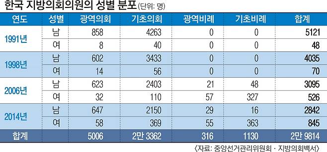 14일 권경득(전 한국지방자치학회장) 선문대 글로벌행정학과 교수팀이 작성한 ‘한국 지방의회의원의 사회적 배경에 관한 연구: 다양성 분석을 중심으로’에 따르면 지난 7번의 선거에서 선출된 지방의원 2만 9814명(광역의원 5322명·기초의원 2만 4492명) 중 여성은 2452명(8.2%)에 그쳤다. 1998년까지 선거마다 4000~5000명을 웃도는 당선자 중 여성은 100명도 되지 않았다.