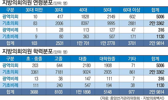 연령별로는 40~50대가 2만 3479명(78.8%)이었다. 그러나 1995년부터 동시에 치르는 자치단체장 선거와 비교했을 때 비교적 ‘젊은’ 당선자를 배출했다. 자치단체장에게선 없었던 20대 당선자가 103명(0.3%)이었고, 30대 당선자도 2531명(8.5%)으로 30대 단체장 당선자 비율(1%)보다 8배 이상 높았다. 최연소 당선자는 만 25세였다. 1995년 부산 사상구 학정동에서 무소속으로 당선된 김권태 전 기초의원과 2006년 대전 중구에서 열린우리당 기초의원 비례대표로 당선된 김온일 전 기초의원이다. 학력별로도 대졸 이상 고학력자가 1만 7046명(57.1%)으로 과반수를 차지했지만, 비교적 다양한 학력에서 충원이 이뤄졌다. 특히 2006년부터 시작된 기초의원 비례대표에선 항상 모든 학력에서 당선자가 나왔다.