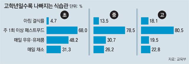 아침 식사를 거르는 학생 비율은 학년이 올라갈수록 높아져 초등학생 4.7%→중학생 13.5%→고등학생 18.1%였다. ‘주 1회 이상 패스트푸드를 먹는다’고 답한 학생도 학년이 올라갈수록 많았다. 반면 건강에 좋은 우유·유제품, 채소를 매일 먹는 비율은 학년이 오를수록 오히려 낮아졌다.