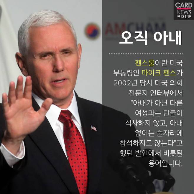 '펜스룰'이란 미국 부통령인 '마이크 펜스'가 2002년 당시 미국 의회 전문지 인터뷰에서 “아내가 아닌 다른 여성과는 단둘이 식사하지 않고, 아내 없이는 술자리에 참석하지도 않는다”고 했던 발언에서 비롯된 용어입니다.