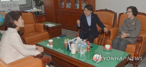 (서울=연합뉴스) 김현태 기자 = 임이자 국회 고용노동소위원장(가운데)과 한정애 더불어민주당 간사(왼쪽), 김삼화 바른미래당 간사가 16일 국회 환경노동위원장실에서 의견을 나누고 있다. 국회 고용노동소위원회는 최저임금 산입 범위를 조정하는 내용의 최저임금법 개정안을 심사할 예정이다. 2018.3.16