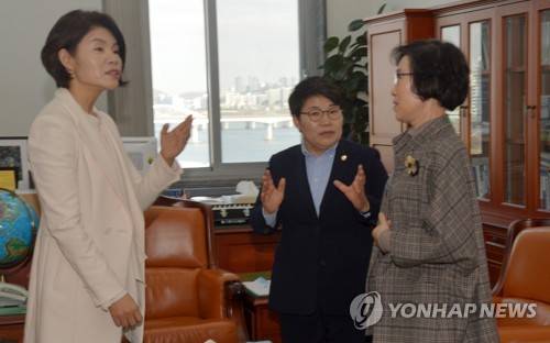 (서울=연합뉴스) 김현태 기자 = 임이자 국회 고용노동소위원장(가운데)과 한정애 더불어민주당 간사(왼쪽), 김삼화 바른미래당 간사가 16일 국회 환경노동위원장실에서 의견을 나누고 있다. 국회 고용노동소위원회는 최저임금 산입 범위를 조정하는 내용의 최저임금법 개정안을 심사할 예정이다. 2018.3.16