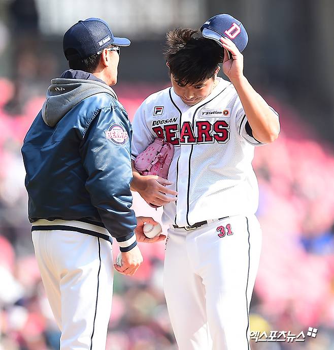 [엑스포츠뉴스 김한준 기자] 17일 오후 서울 송파구 잠실야구장에서 열린 '2018 신한은행 MY CAR KBO리그' LG트윈스와 두산 베어스의 경기, 7회초 2사 1,2루 두산 김정후가 마운드를 내려가고 있다.