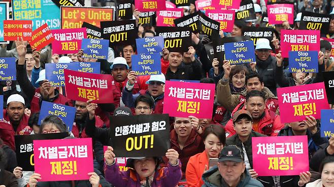 세계인종차별철폐의 날(3월21일)을 사흘 앞둔 18일 서울 종로구 보신각 앞에서 외국인이주·노동운동협의회와 난민네트워크, 이주공동행동, 차별금지법제정연대 공동주최로 열린 '2018 세계 인종차별철폐의 날 공동행동'에서 참석자들이 손피켓을 들고 구호를 외치고 있다.