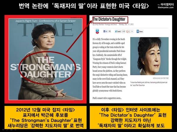 일부 언론은 '독재자의 딸'로 번역했지만, 새누리당은 <타임>이 '강력한 지도자의 딸 : 역사의 후예'라는 제목으로 박근혜 후보를 표현했다'라고 주장했습니다.
