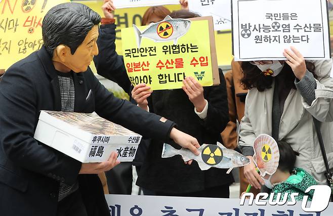 (서울=뉴스1) 허경 기자 = 시민방사능감시센터 관계자들이 19일 서울 종로구 옛 일본대사관 앞에서 열린 일본산 식품 수입규제·WTO패소 대응 촉구 기자회견에서 아베 신조 일본 총리의 후쿠시마 수산물 강요 퍼포먼스를 하고 있다. 2018.3.19/뉴스1