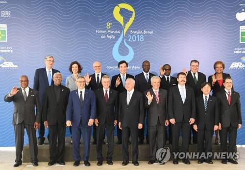 (서울=연합뉴스) 이낙연 국무총리(뒷줄 왼쪽 네번째)가 19일(현지시간) 브라질 수도 브라질리아에서 개막한 제8차 세계물포럼에서 관계자들과 기념촬영하고 있다. 2018.3.20 [국무총리실 제공=연합뉴스]