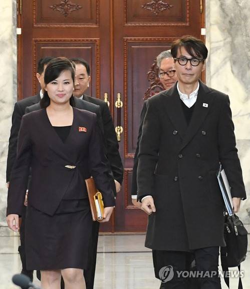 (서울=연합뉴스) 20일 오전 판문점 통일각에서 열린 예술단 실무접촉에서 남측 수석대표로 나선 윤상 음악감독과 북측 대표 현송월 삼지연관현악단 단장이 회의장에 입장하고 있다. 2018.3.20 [통일부 제공=연합뉴스]