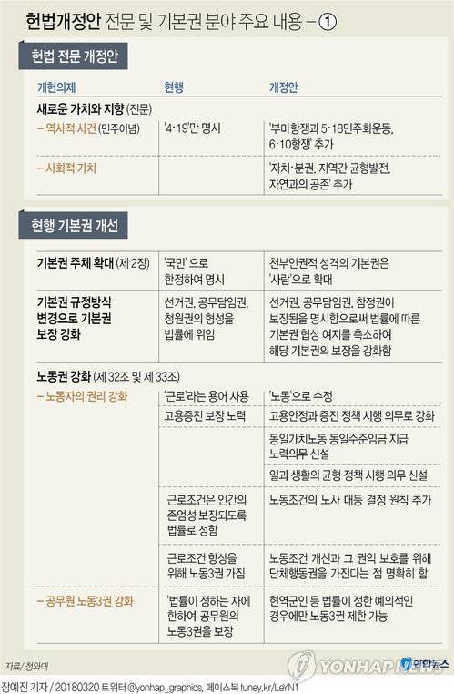 (서울=연합뉴스) 박경준 기자 = 문재인 대통령의 개헌안에는 기존의 헌법에 명시돼 있던 기본권을 개선하는 내용이 비중 있게 포함됐다.