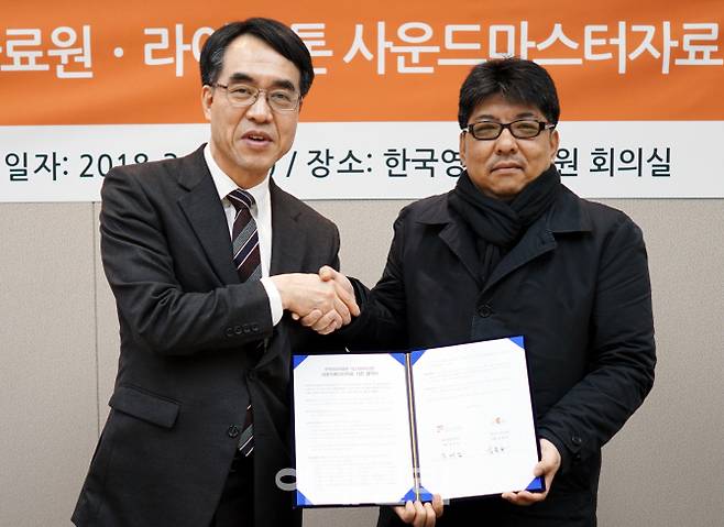 20일 서울 마포구 한국영상자료원에서 열린 '사운드마스터자료 기증식'에서 류재림(왼쪽) 한국영상자료원장과 최태형 덱스터라이브톤 기술이사가 업무협약을 체결하고 있다.