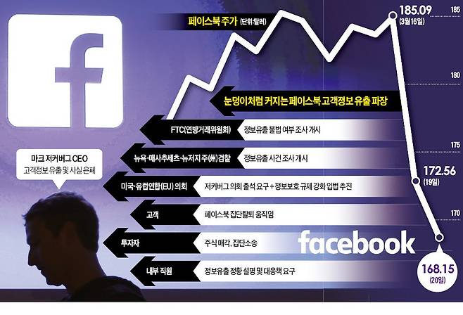 이들은 소장에서 “페이스북이 그릇되고 사실을 호도하는 발언을 했고, 회원 동의 없이 제3자에게 수백만 명의 개인정보에 접근하도록 허용해 자체 정보보호 규정을 위반했다”고 주장했다. 페이스북 주가는 전날 6.8%에 이어 이날도 2.6%가 빠졌다. 지난달 1일 고점에서 무려 14% 곤두박질쳤다.